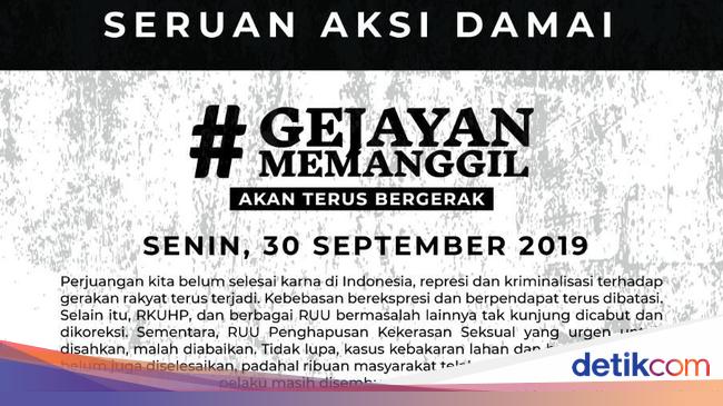 Pantauan detikINET, Senin (30/9/2019) pagi ini ada dua tagar yang memuncaki trending topic Twitter di Indonesia. Ada #GejayanMemanggil2 dengan 30.000 tweet yang merupakan tagar aksi mahasiswa khususnya di Yogyakarta.