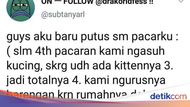 "Guys, aku baru putus sama pacarku :( slm 4th pacaran kami ngasuh kucing, skrg udh ada kittennya 3. jadi totalnya 4. kami ngurusnya barengan krn rumahnya deket2an, kl gini hak asuhnya gmn ya? sm2 mau induknya :( Tanyarl," begitu cuitan tersebut.